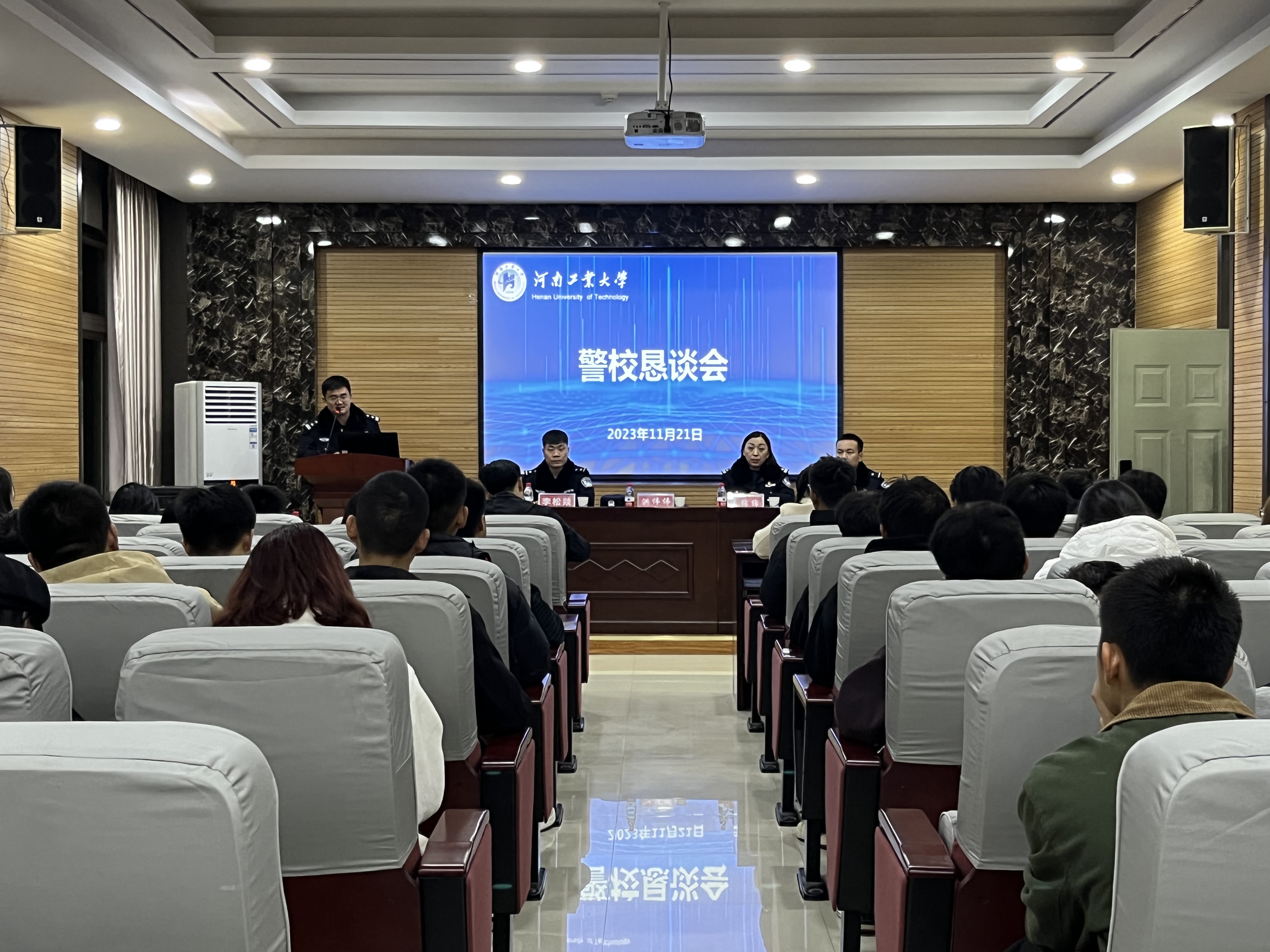 、保卫处联合郑州高新公安分局在亚洲av6228会议室举办警校恳谈会。郑州公安高新区分局情报指挥中心教导员李绵绵、民警洪伟伟、刘智隆、李松燚;学校保卫处副处长李磊、亚洲av全体辅导员及150余名学生代表参加警校恳谈会。
