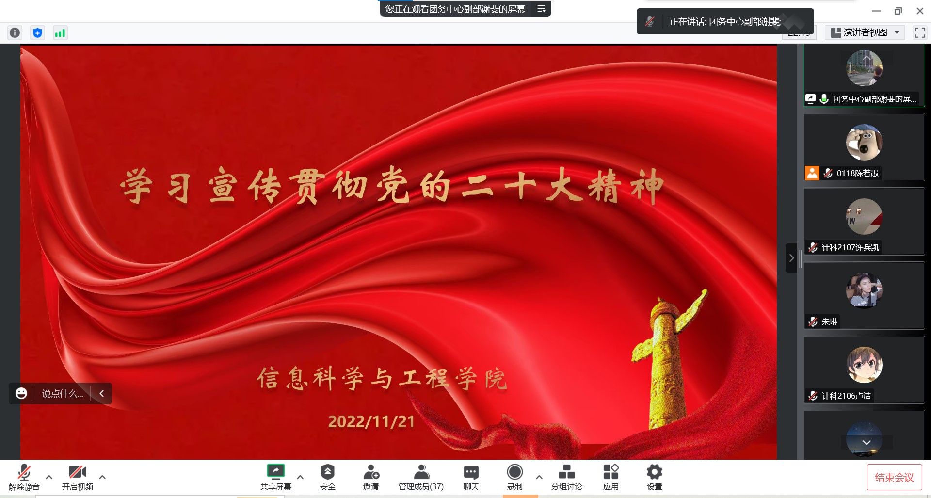 最后,陈若愚进行总结发言,学习领会党的二十大精神,一定不能只言片语、就事论事,要从历史逻辑、实践逻辑、理论逻辑出发,联系马克思主义基本原理学,联系习近平新时代中国特色社会主义思想与习近平总书记系列重要论述、重要讲话精神学,联系新征程的艰巨性、复杂性与重大战略部署学,我们必须增强忧患意识,坚持底线思维,做到居安思危、未雨绸缪,准备经受风高浪急甚至惊涛骇浪的重大考验,全力为谱写新时代中国特色社会主义更加绚丽的华章贡献青春力量。