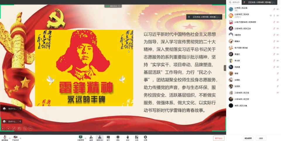 本次团日活动以线上的形式进行,由研究生22级专硕二班团支部共同商议活动时间和活动内容,并制作相关PPT,宣传委员通知会议号以及时间,同学们在会议上积极发言。通过本次活动,同学们深受启发,让同学们认识到学习雷锋,就要学习他的“钉子”精神,做任何事情都要认真求实,敢于钻研,敢于深入。