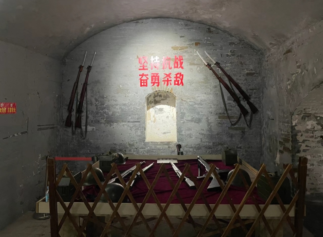 进入大门,“坚持抗战,奋勇杀敌”八个大字呈现眼前,另配有多具步枪,文物虽旧,革命先烈们的无畏精神依旧屹立至今。生动展现了在中国共产党的领导下,豫西抗日根据地军民团结一致,共赴国难的革命精神。