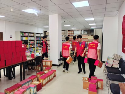 图4 崔华启、贺家豪、王峰基同学正在将整理后的图书归类摆放