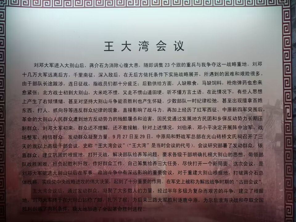 由讲解员刘丹阳向团队成员介绍了王大湾会议的故事,“‘王大湾’会议是刘邓大军挺进大别山以后,在军事、政治斗争中有深远影响的重要会议。”宋丹阳说,这次会议是刘邓大军挺进大别山的重大转折,对于重建大别山根据地,打破蒋介石总体战略,实现党中央战略进攻的伟大决策,实现毛主席说的“历史的转折点”,起了极为重要的作用。此外在“王大湾”会议之后,各部队迅速开展了轰轰烈烈的军政竞赛,部队的战斗面貌为之一新。根据会议精神和刘邓首长巧妙部署,大军继续实施战略展开,机动歼敌,先后取得了张家店歼灭战和高山铺大捷等重大胜利,终于在大别山站稳了脚跟,打开了新局面。