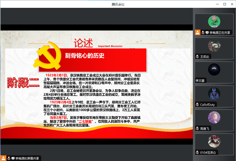 当天下午7时30分,队长组织在腾讯会议进行直播,通过ppt的形式进行理论知识的加深活动。7时30分至8时30分重点讲述了新中国成立之初的二七纪念塔。第一部分为一段刻骨铭心的历史,从“20世纪初的军阀混战,导致贫苦农民和手工业者为了生存,纷纷到铁路上找碗饭吃。”的背景开始,讲述了二七纪念塔建造的背景与当时的时代氛围,刻骨铭心的历史令人久久不能释怀;第二部分为一种生死与共的革命信念,分别解析了二七精神的具体内涵与历史意义这种精神是争人权争自由的高度的革命自觉性;这种精神是团结战斗、生死与共的革命信念。这场运动开创了中国工人阶级与工会跟党走的历史典范。第三部分是一次次绽放时代的光芒,讲述了二七塔的成就与对当代青年具有非同凡响的意义;二七精神也在历史的长河中不断符合着最新的价值观,与国家发展高度契合。郑州二七纪念塔自诞生之日起就带着历史的记忆,镌刻着红色的基因,自1971年落成以来,它就像一位岁月老人,见证着郑州这座城市的发展与变迁,而其所代表的“二七精神”,也在一代代郑州人中延续和传承。
