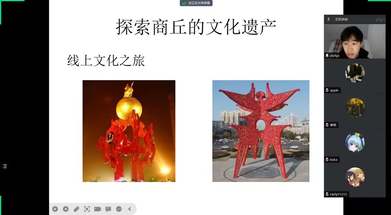 下午,许兵凯同学接棒,通过线上方式带领观众深入了解商丘的文化底蕴。他详细介绍了古城商丘的历史演变、商丘博物馆及其珍贵藏品,以及商丘的传统工艺,如同开启了一扇了解商丘深厚历史文化的大门。