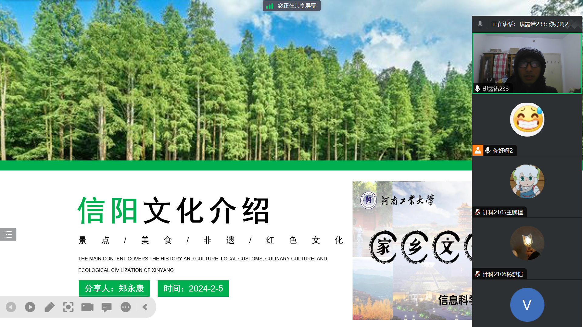 上午,郑永康同学首先介绍了信阳的历史文化、风土人情以及生态文明建设等方面。