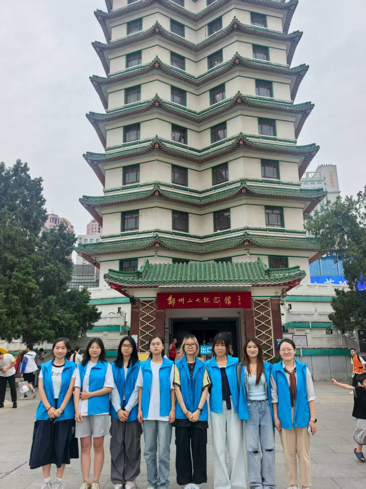 二七纪念塔作为全国重点文物保护单位,是为纪念1923年京汉铁路工人大罢工而建,承载着中国工人运动的光辉历史。志愿服务队成员抵达后,首先在塔前整齐列队,与院旗庄重合影,以此开启本次红色实践之旅。