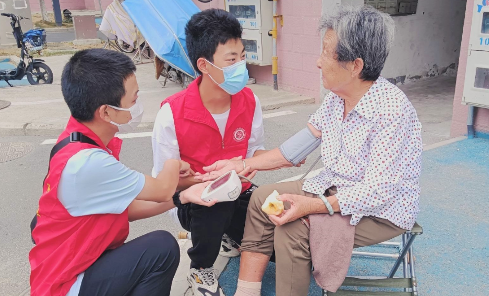 生活组的队员们推着行动不便的王凤女士在花园里散步,王凤女士腿脚不便,很少出门,看到满院的月季花开得正艳,忍不住伸手触摸:“这花真好看,还是春天来过一次呢。” 队员们一边帮她整理衣角,一边讲学校里的趣事,王女士听得入神,不时问:“你们上课累不累?食堂的饭合胃口吗?”