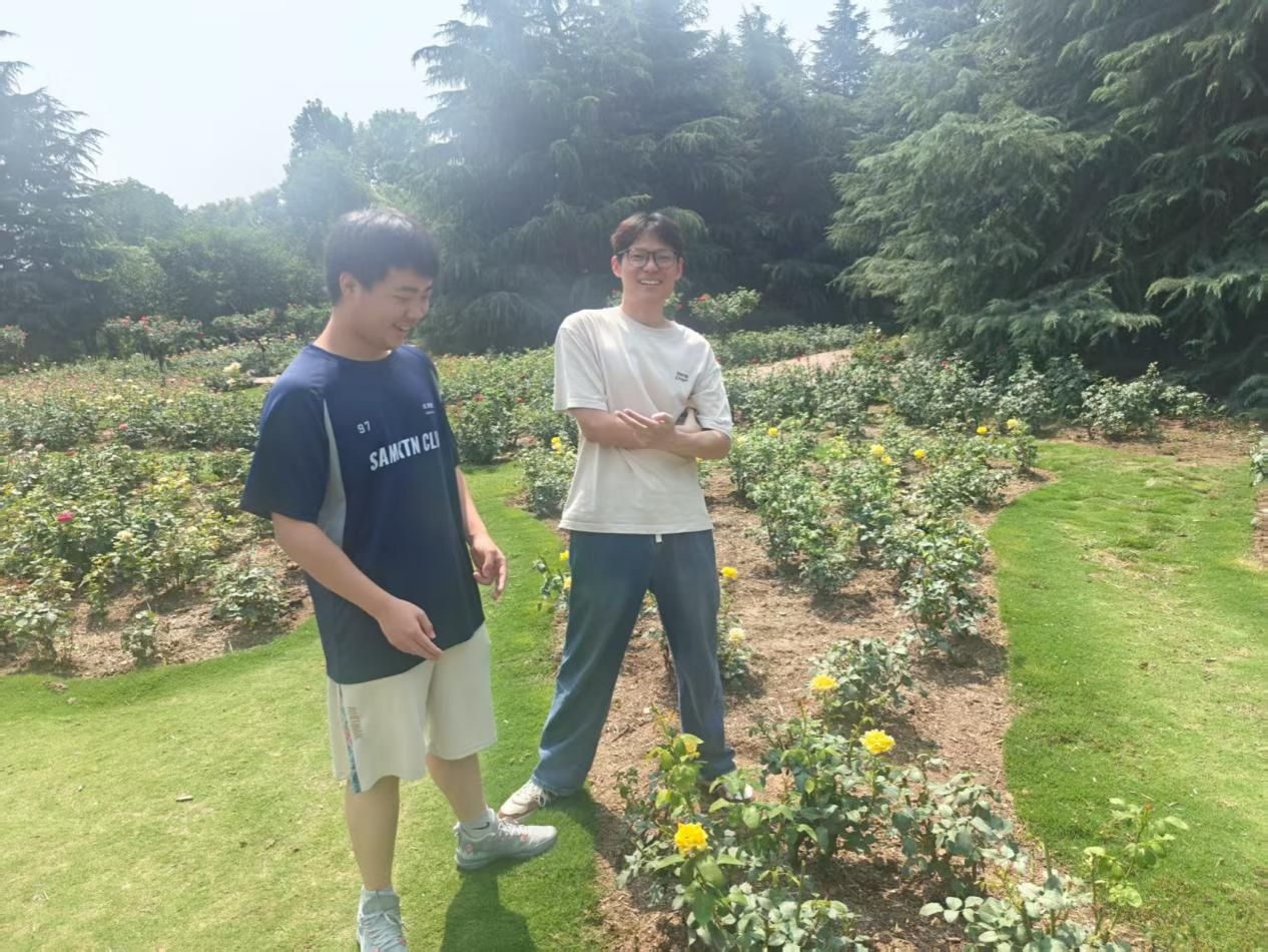活动首站为月季园,团队负责人王思宁面向游客热情邀请:“欢迎各位来到郑州植物园月季园!这里是‘花中皇后’月季的乐园,接下来请刘天睿为大家介绍月季的特点!”刘天睿走到一株盛放的红色月季旁,结合诗词讲解:“宋代诗人杨万里曾写道‘只道花无十日红,此花无日不春风’,说的就是月季。它花期很长,能月月开花、四季不败,所以又叫‘月月红’,咱们园里有上百种不同花色、花型的月季。”游客刘科宏听后惊叹:“这么多品种!不同颜色的月季有特殊寓意吗?”
