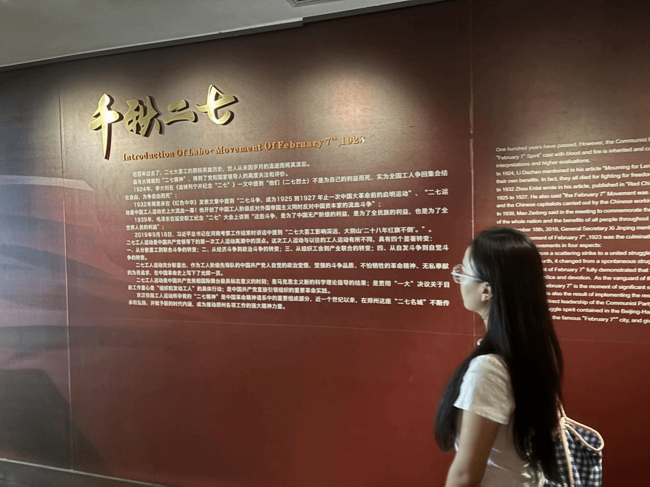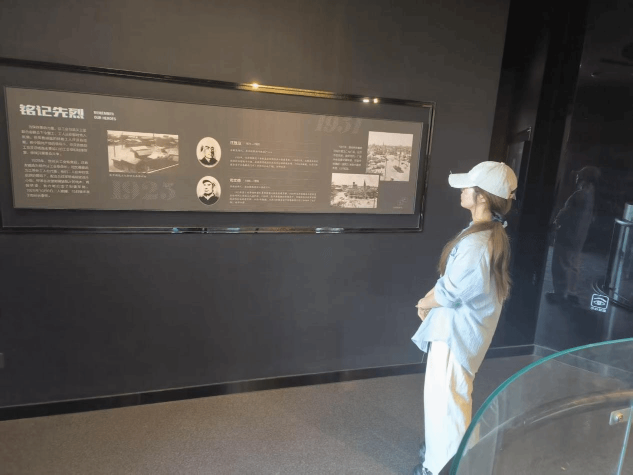 成员陶梦婷同学驻足于一组罢工工人使用过的工具前,仔细阅读展板上的文字介绍:“1923 年 2 月 4 日,京汉铁路工人以‘争人权、争自由’为口号,举行全路总罢工,3 万余名工人在党的领导下实现了统一行动。” 她在交流中表示:“这些锈迹斑斑的扳手、信号灯,见证了工人阶级从自发斗争到自觉革命的觉醒过程,让我对‘团结就是力量’有了更深刻的理解。”