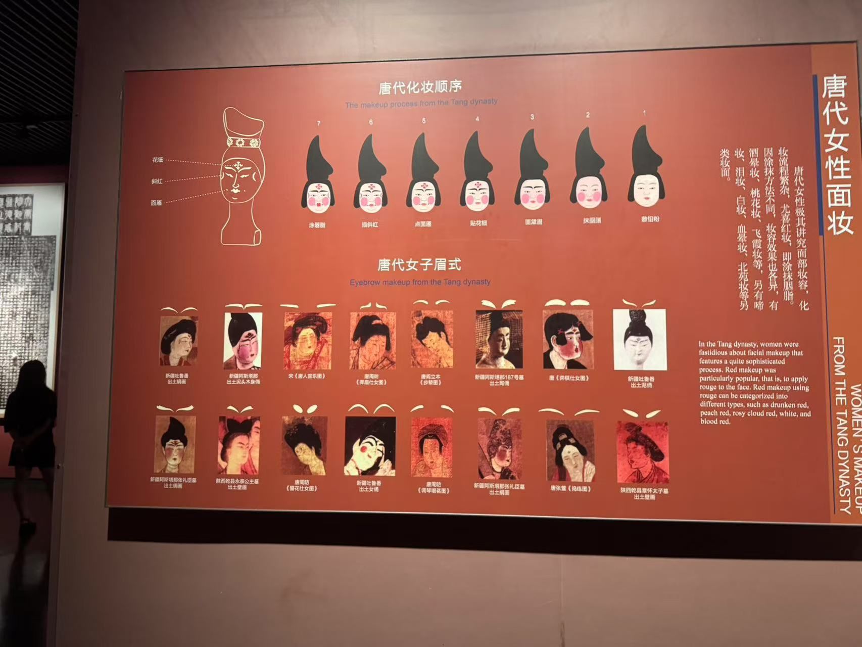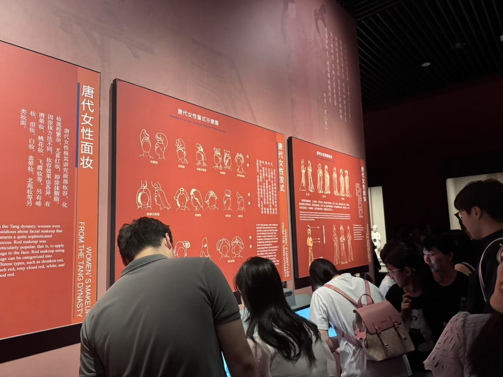 踏入展厅,唐代女性面妆、妆饰展板成为关注焦点。从细致的 “敷铅粉、抹胭脂” 化妆流程,到多样的花钿、眉式,再到丰富的发髻造型,生动呈现唐代美妆风尚。讲解员深入解读:“唐代女性美妆不只是审美体现,更折射出开放包容的社会风貌,是历史变迁的微观注脚。” 成员们驻足凝视,从眉形变化、面妆色彩里,探寻唐代文化多元。