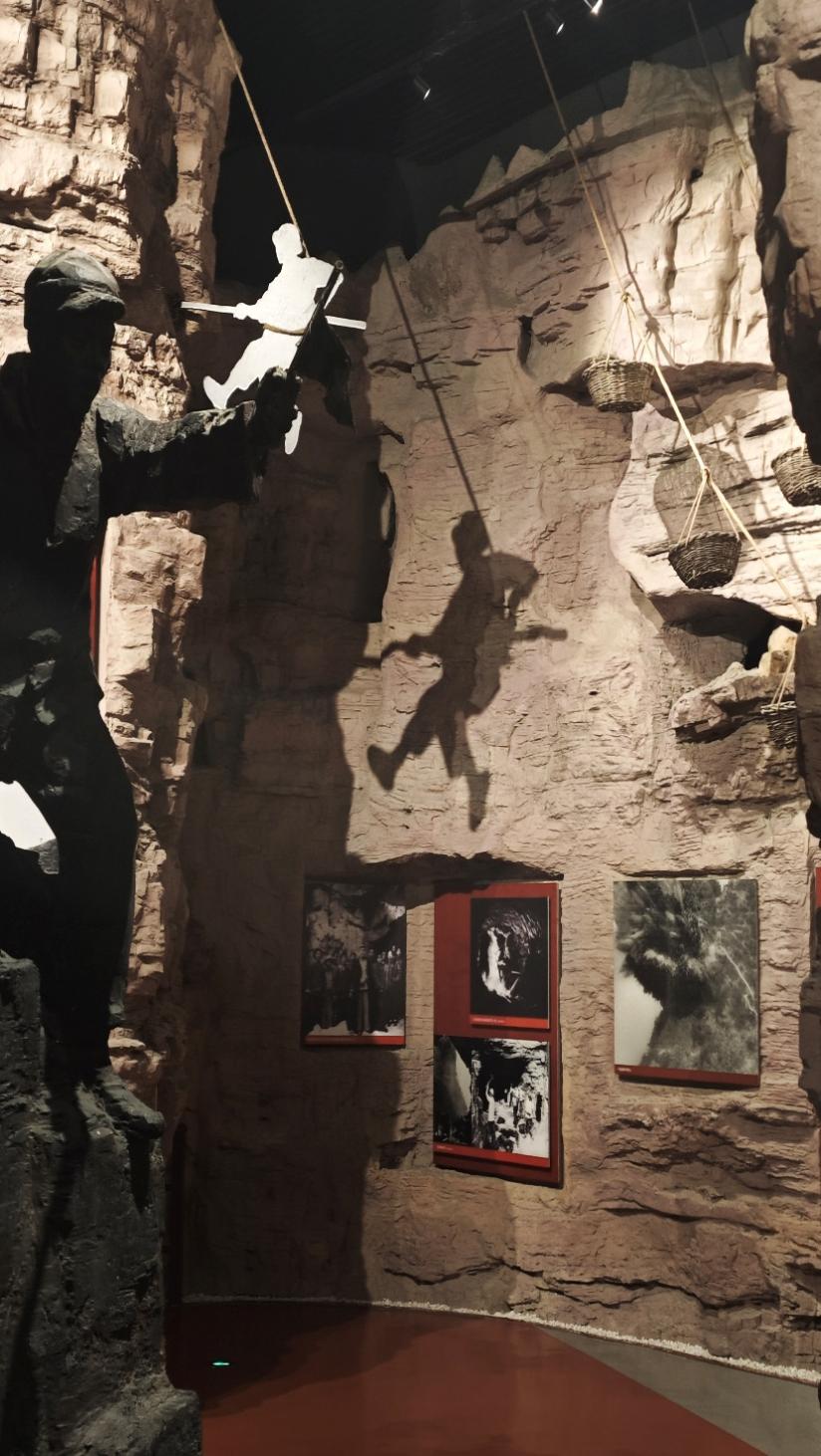 此时馆内一处场景,吸引了团队成员的注意。它以雕塑、光影与老照片结合,生动还原修渠场景:勇士凌空作业,影子投射岩壁,展现当年修渠人攀悬崖、战艰险的无畏。珍贵影像与场景交织,再现红旗渠开凿的艰辛历程,让实践队员直观感受林县人民“愚公移山”般的奋斗。此次参观,为团队暑期实践注入了厚重的历史养分 。