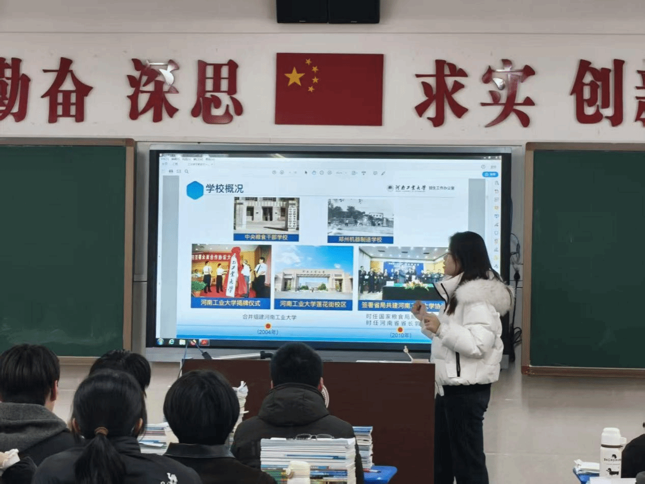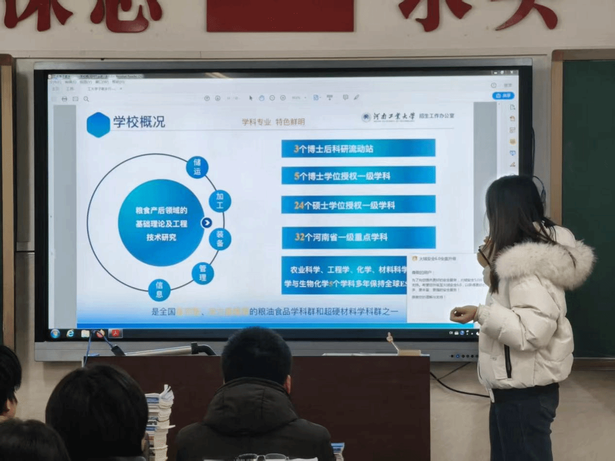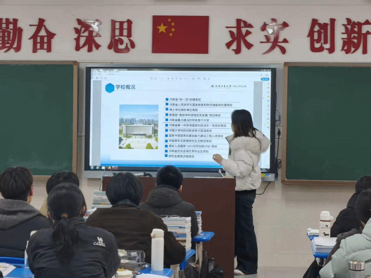 在办学实力解读环节,团队重点展示包含核心资质的 PPT,逐一介绍 “河南省‘双一流’创建高校”“国家‘2011 计划’参与单位”“博士学位授权单位” 等官方认证,补充 “连续多年获评河南省就业工作先进集体” 的实绩,让学子们全面认知学校的办学硬实力。现场学子认真记录,不少人主动询问资质背后的学科支撑逻辑。