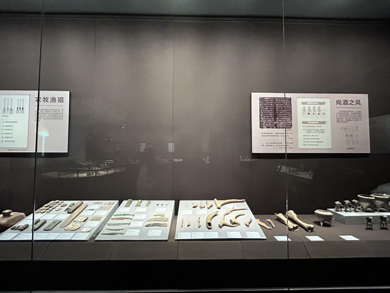 展柜旁 “农牧渔猎” 与 “尚酒之风” 的展板,将先民们耕种渔猎的日常与祭祀宴饮的习俗串联起来,骨耜、鹿角矛的质朴纹理,与陶鬶、陶爵的精巧造型相互印证,让大家直观感受到中原先民从生存到生活的文明进阶。